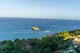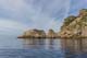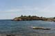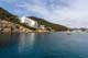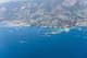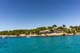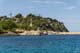 umgeben von grünen Bergen, die felsig ins azurblaue Meer auslaufen.