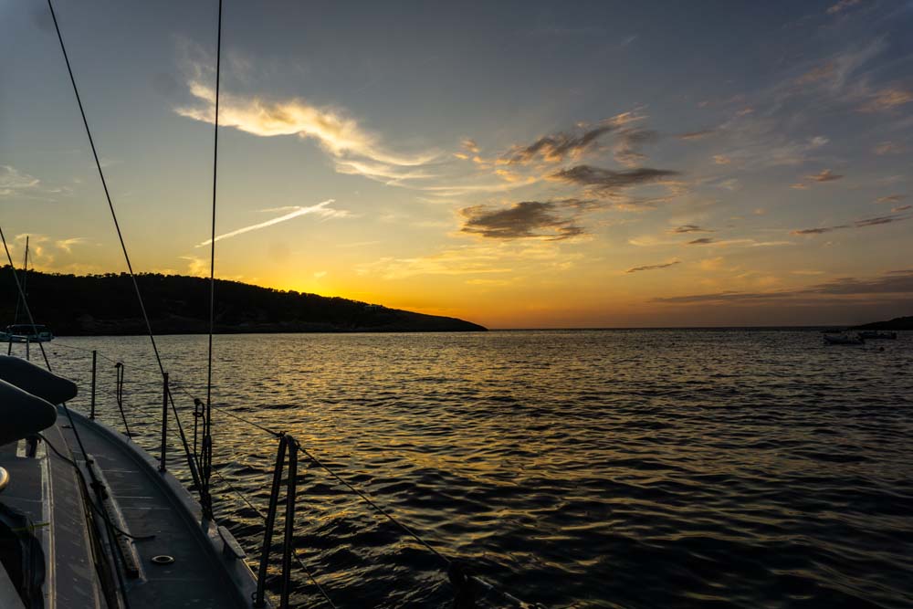Die Sonne lugte schon über S'Espalmador, als einer nach dem anderen aus seiner Koje kroch und es aus der Pantry gleich nach frisch