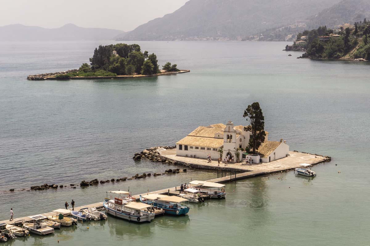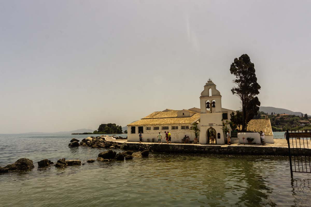 Nach einem unspektakulären Flug landeten wir pünklich in Korfu, der Landeanflug erfolgte übrigens direkt neben dem berühmten Kloster Vlacherna,