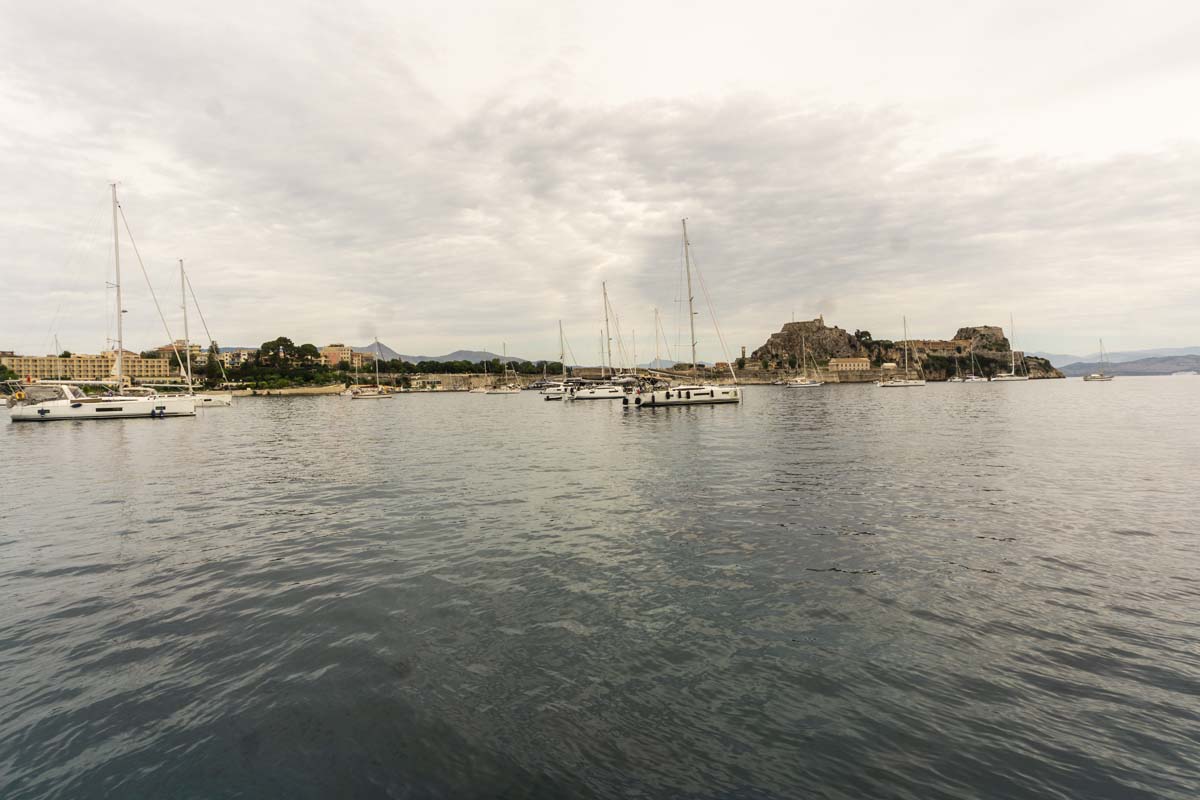 Unter Motor ging es unter blauem Himmel und angenehmen 25°C vorbei an Korfu Stadt mit ihren alten Hafenanlagen mit marodem Charme, modernen Fährterminals,