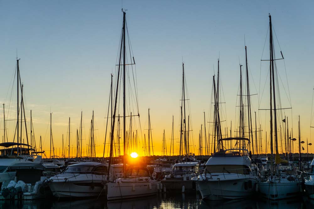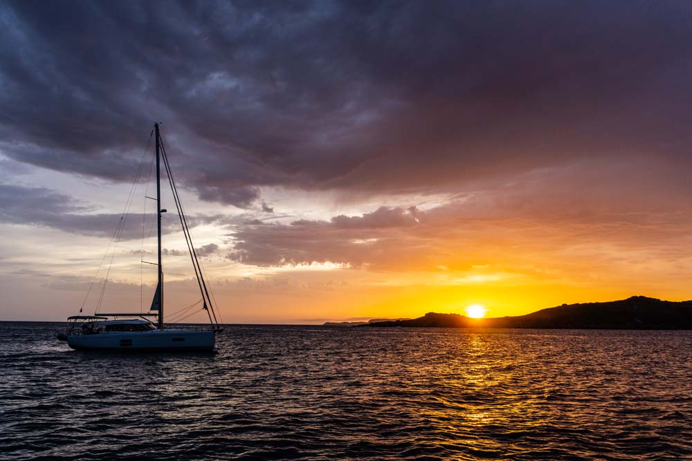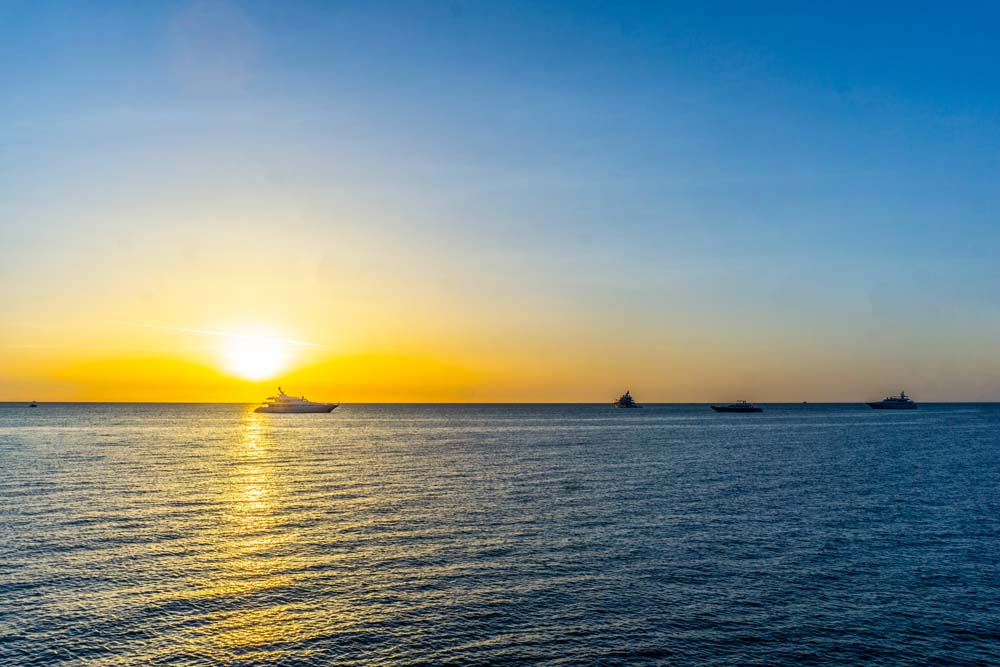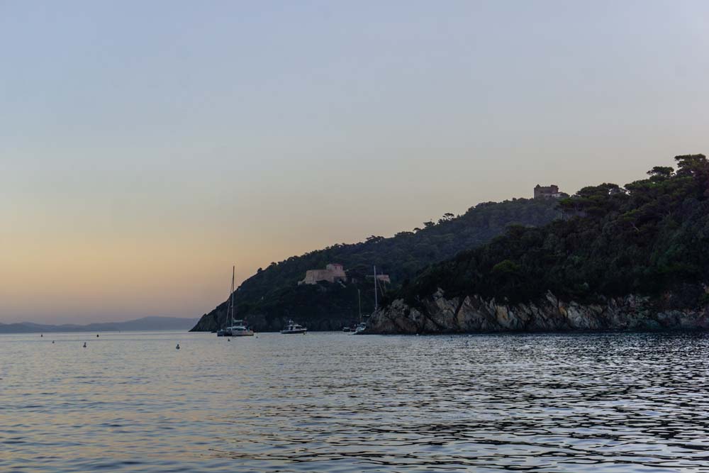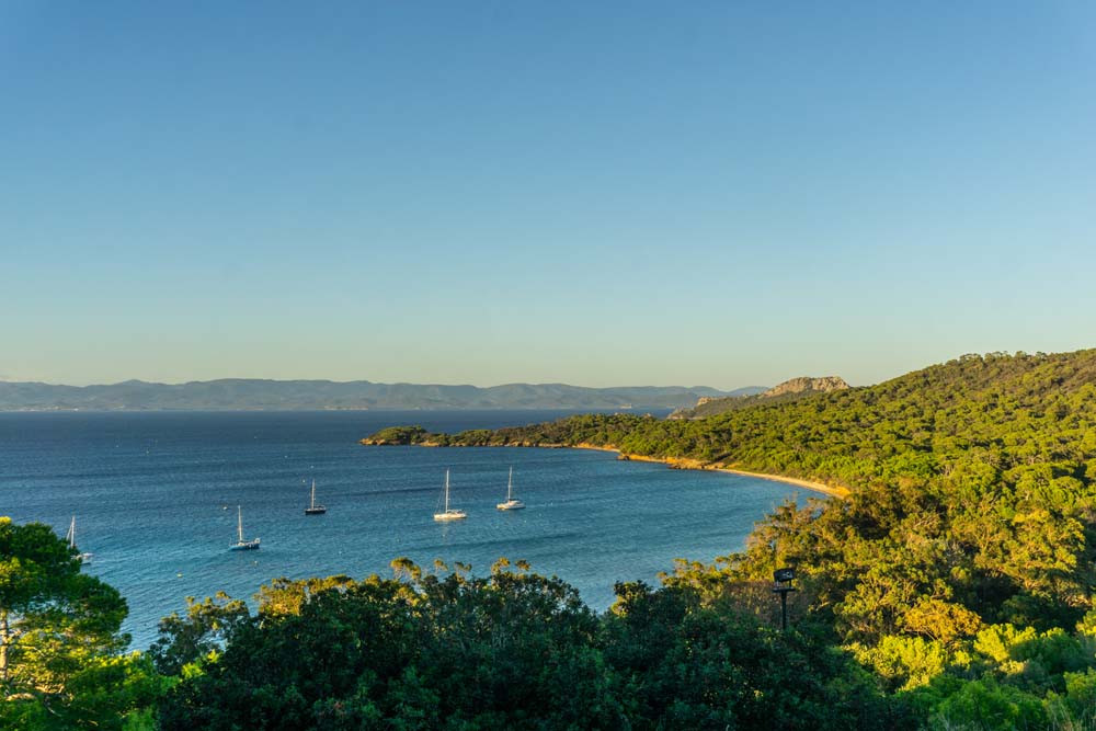 Drink den Blick auf die umliegenden Ankelieger und auf die untergehene Sonne hinter der Nachbarinsel Porquerolles, wo es morgen hingehen wird.