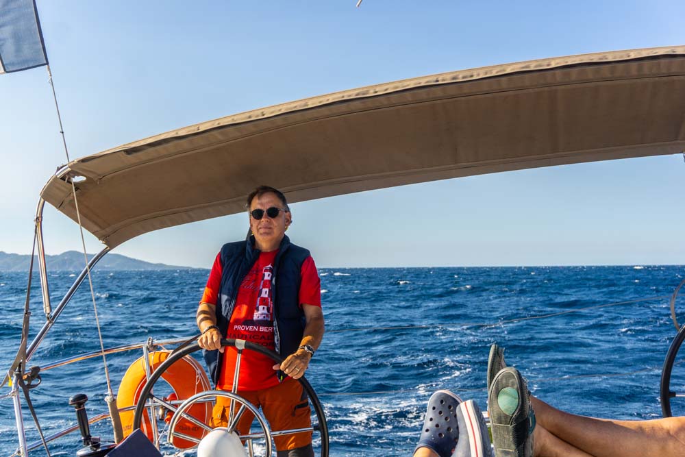 Da es auch heute total windstill war, liefen wir nach unserer Exkursion sofort aus und Georg, unser heutiger Tagesskipper, steuerte uns direkt in Bucht von Canoubiers,