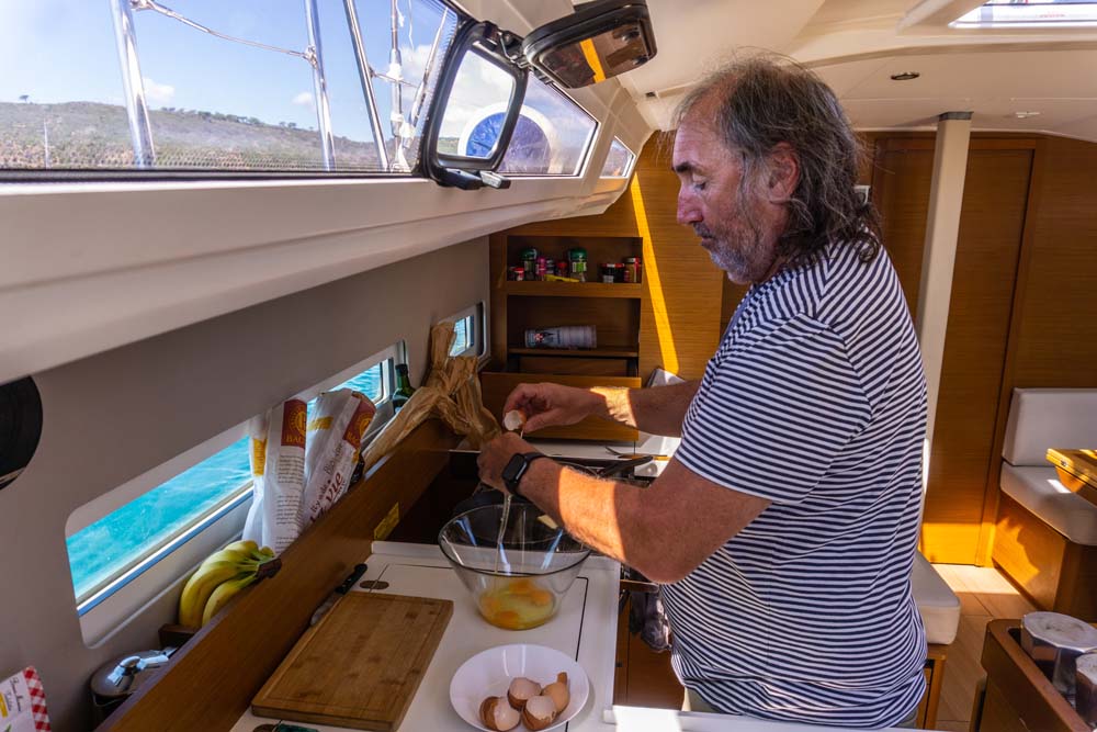 verzog sich Georg direkt in die Pantry um super leckeres Rührei mit Shrimps und knusprigen Speck für uns zu zaubern, hmmm, absolut lecker, vor allem, wenn